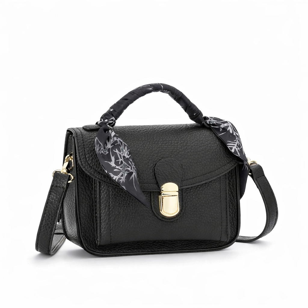 A alça de mão é envolvida por um lenço estampado, trazendo um detalhe delicado e feminino.