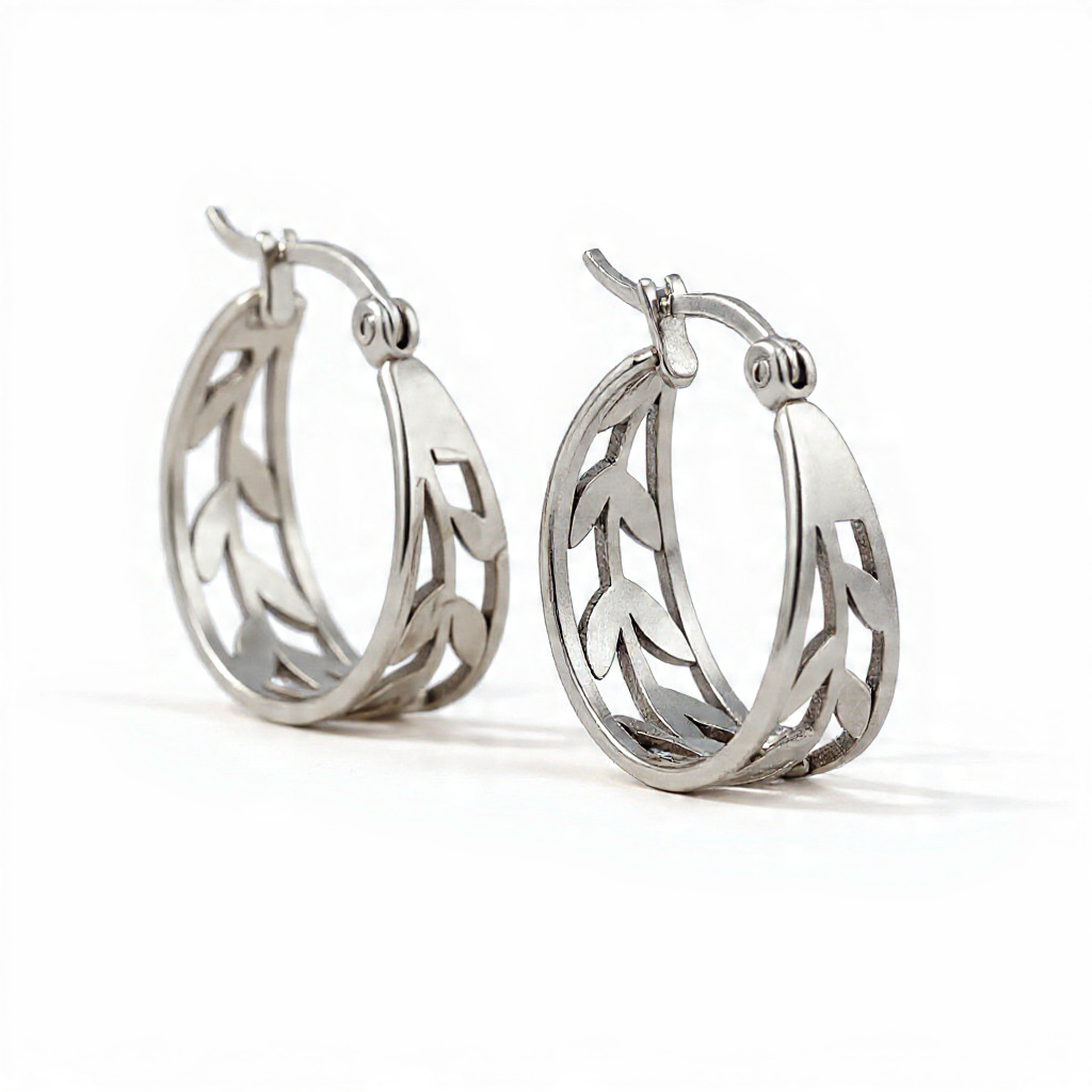 Argolas delicadas em aço inox com detalhe de ramo de oliveira, uma joia que une beleza, significado e sofisticação.