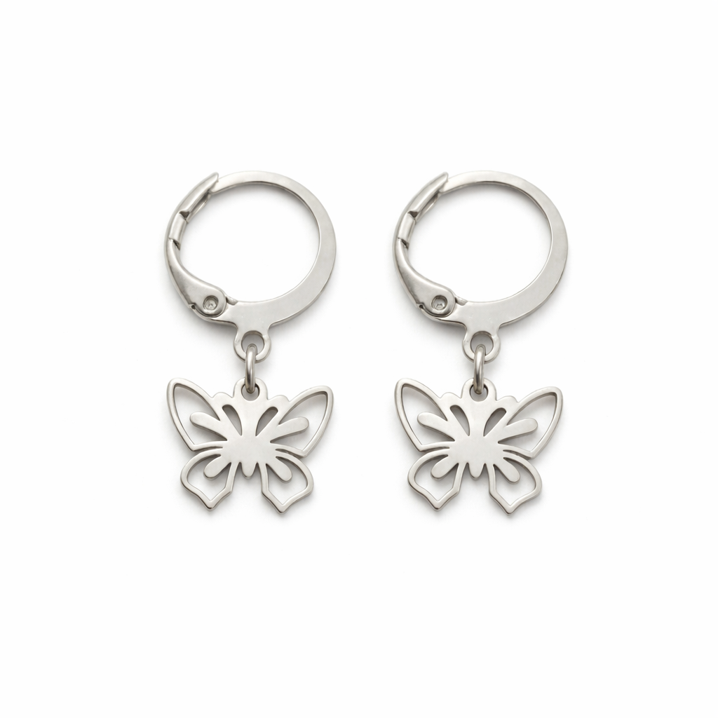 Delicadas argolinhas em aço inoxidável com pingente de borboleta e detalhes vazados que encantam à primeira vista.
