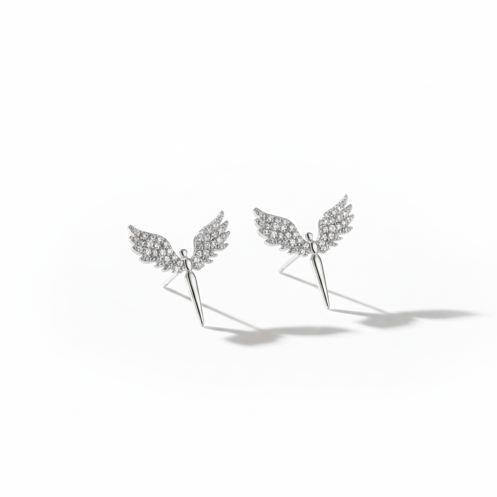 Brinco em aço inox com design de asas de anjo e detalhes em strass, que refletem brilho delicado e sofisticação.