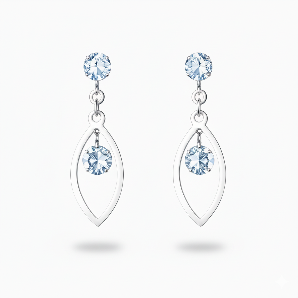 Brinco oval em aço inoxidável com duas zircônias que refletem brilho delicado e sofisticação.
