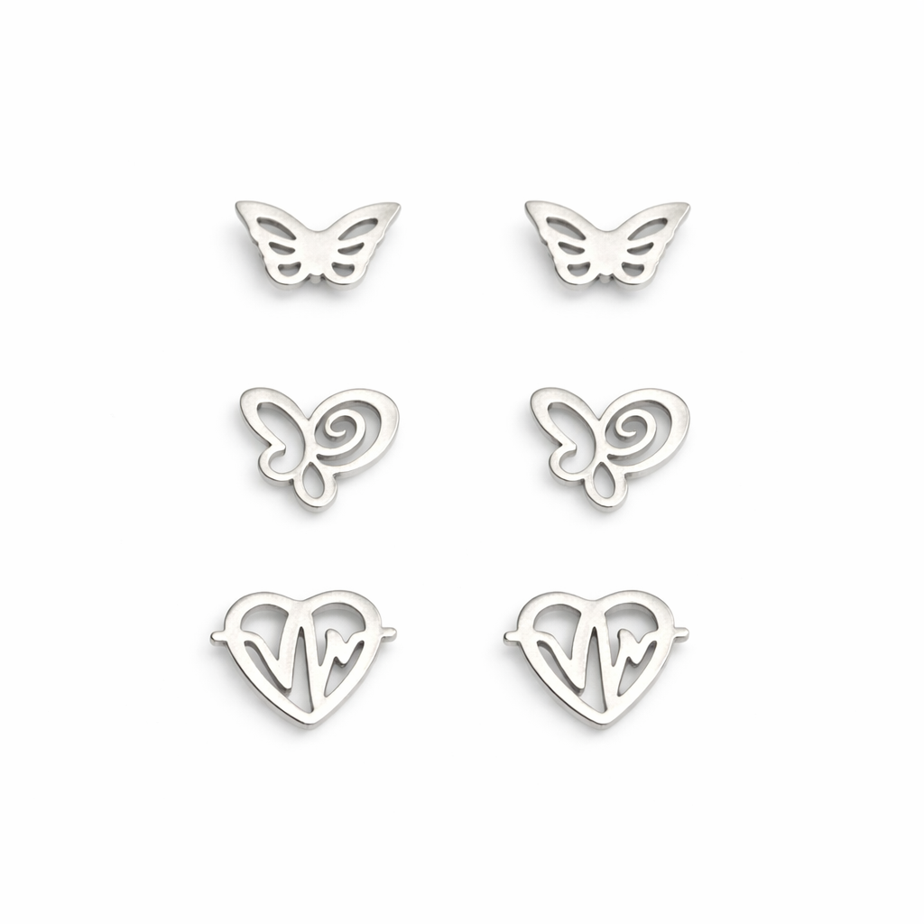 O brinco trio em aço inoxidável é a escolha perfeita para quem ama composições delicadas e modernas. O kit contém 3 pares com designs variados de borboleta e coração, ideais para usar juntos em múltiplos furos ou separados no dia a dia.