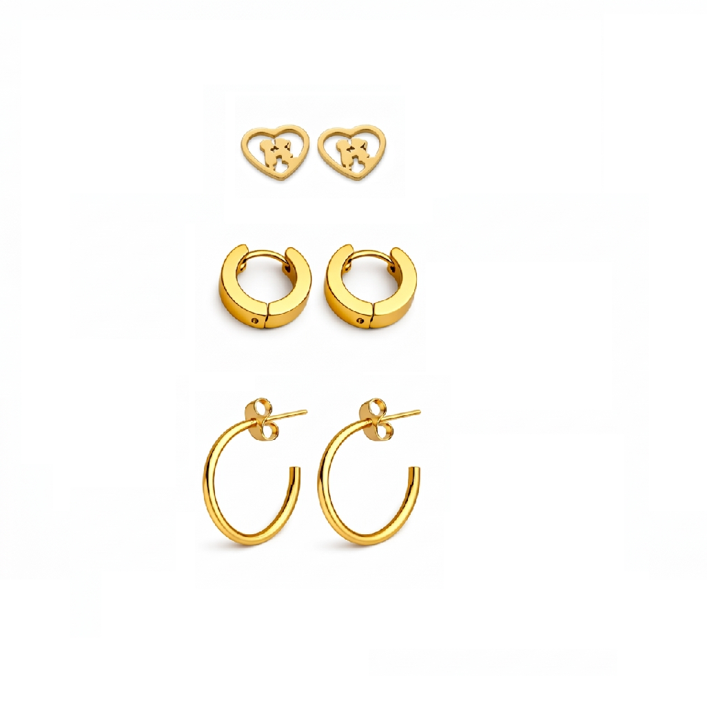 Um trio versátil que combina delicadeza e modernidade em cada detalhe. As argolas minimalistas harmonizam perfeitamente com o brinco de coração, criando um visual básico para o dia a dia.