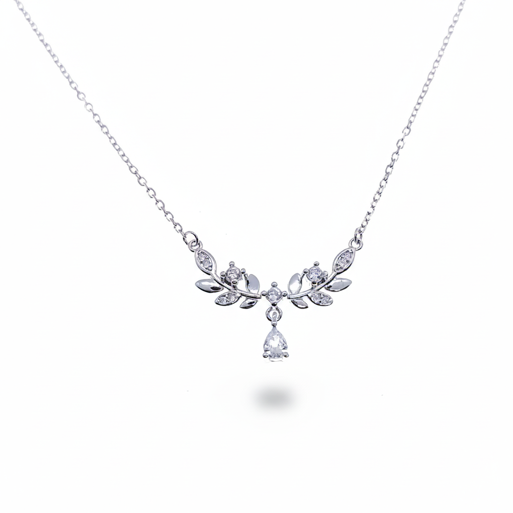 Seu pingente apresenta um fino ramo de louro adornado com pequenas pedras brilhantes, criando um visual leve e refinado. O design curvo acompanha a linha do colo, trazendo um toque moderno e feminino.