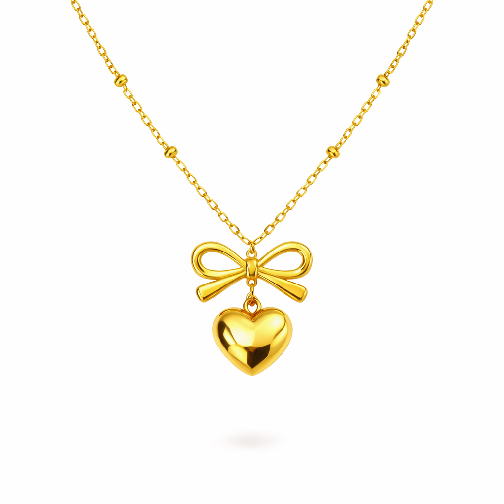 Colar delicado com design romântico, composto por um laço central e pingente em formato de coração.