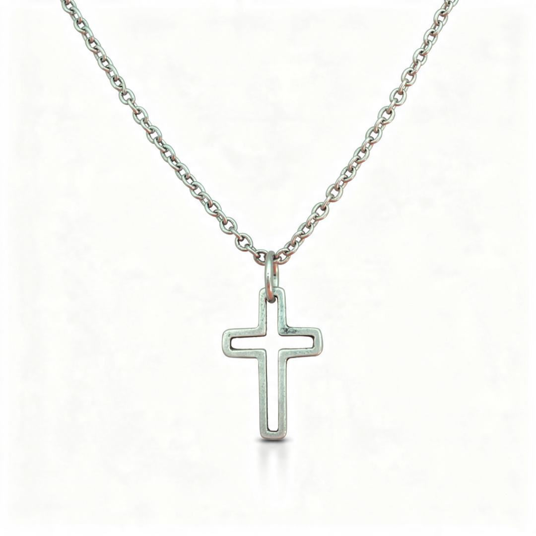 Colar em aço inoxidável com corrente fina e pingente de cruz vazada, de design simples e moderno.