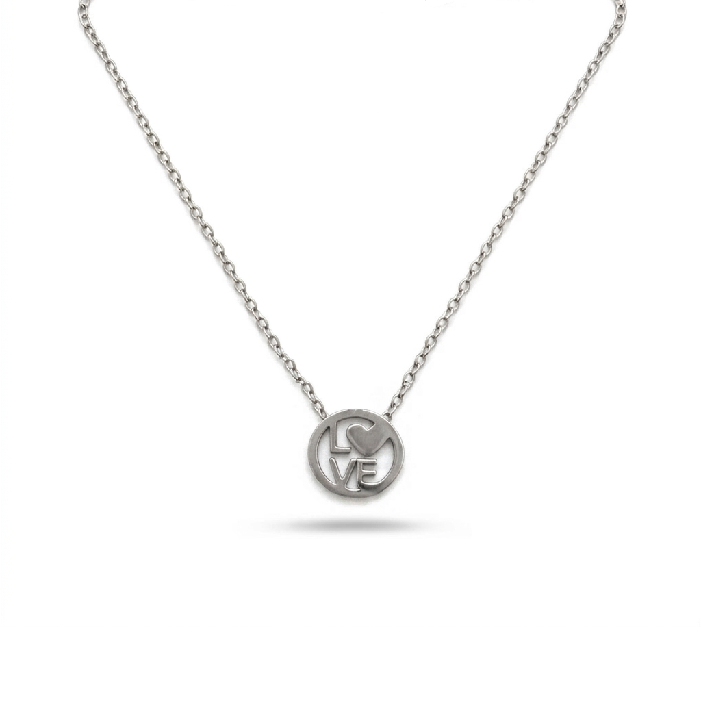 Um colar delicado com pingente de coração que traz a palavra Love em destaque.
