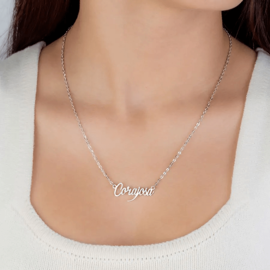Colar de aço inox hipoalérgico, com corrente de elo português e pingente com a palavra "Corajosa".