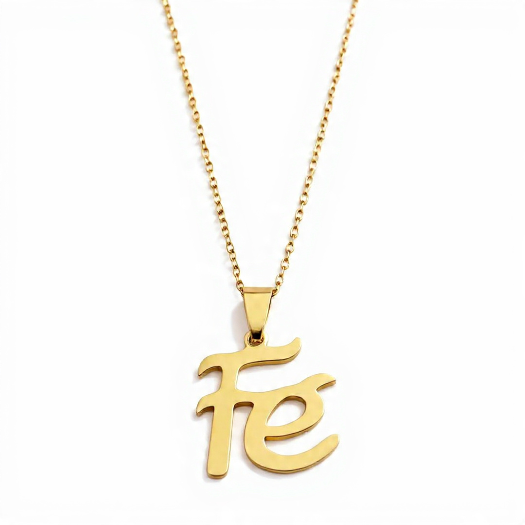O pingente com a palavra fé em acabamento dourado traz um brilho sofisticado e atemporal.
