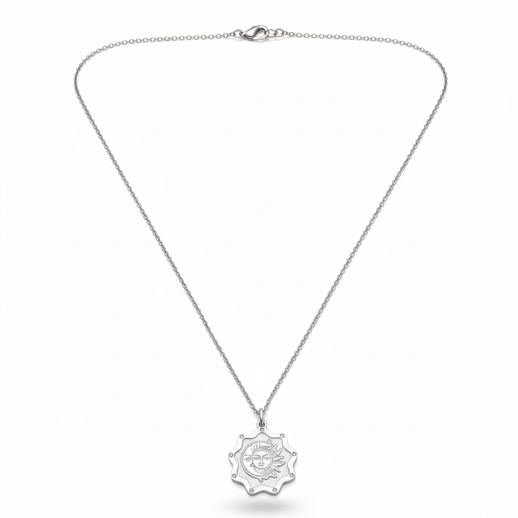 O pingente de Sol e Lua místicos simboliza equilíbrio, luz e energia, com borda delicadamente trabalhada e pequenas estrelinhas ao redor. Uma peça cheia de significado, resistente e perfeita para iluminar suas produções com charme e personalidade.