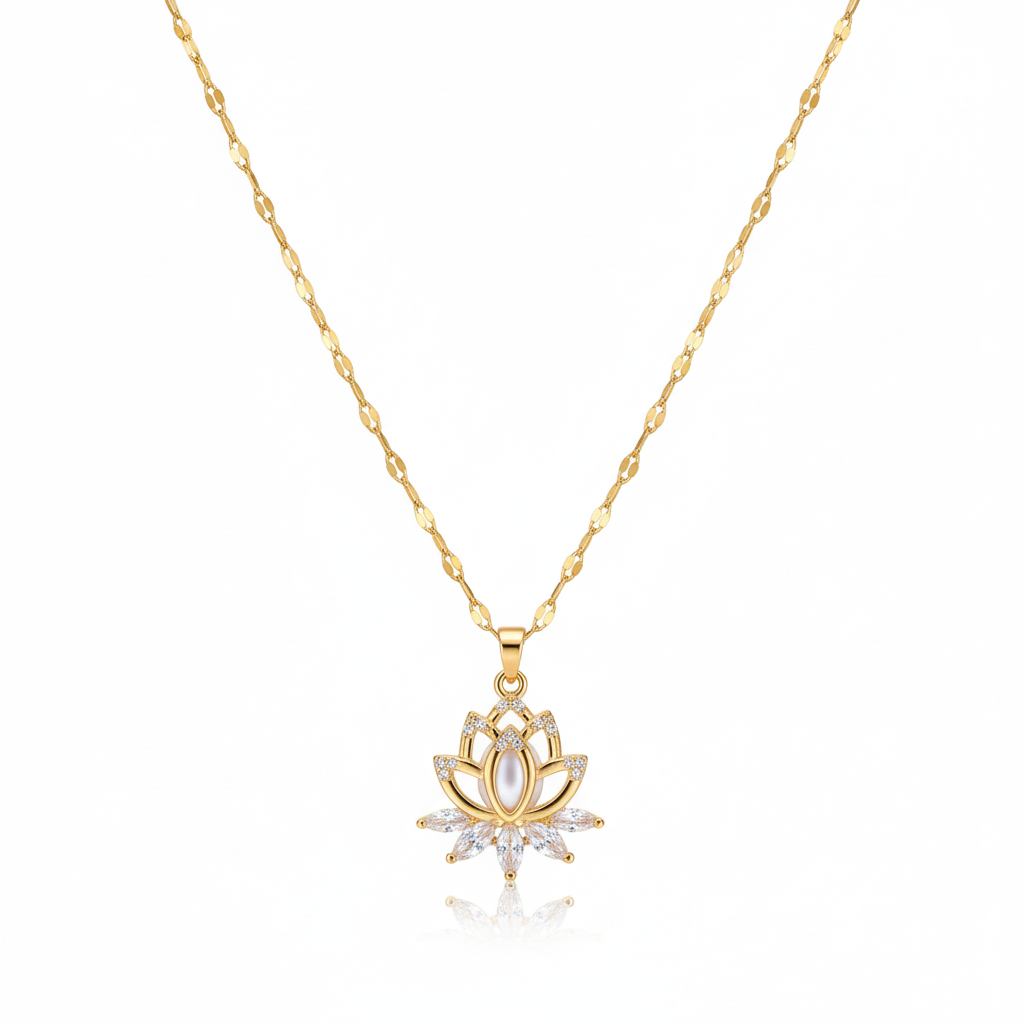 Símbolo de pureza, renascimento e iluminação, a flor de lótus é o destaque deste colar encantador.