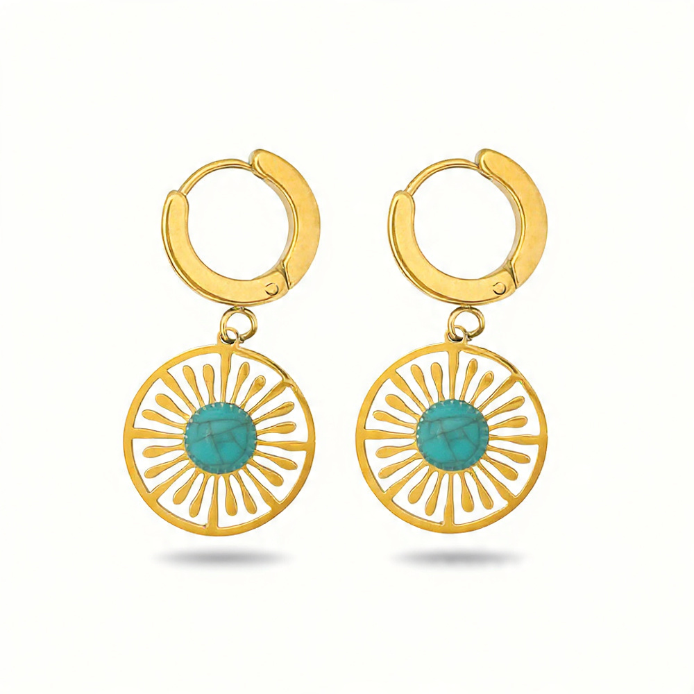 Com design vintage e sofisticado, este brinco combina o charme clássico do dourado com o toque vibrante da pedra turquesa, símbolo de proteção, equilíbrio e boas energias.
