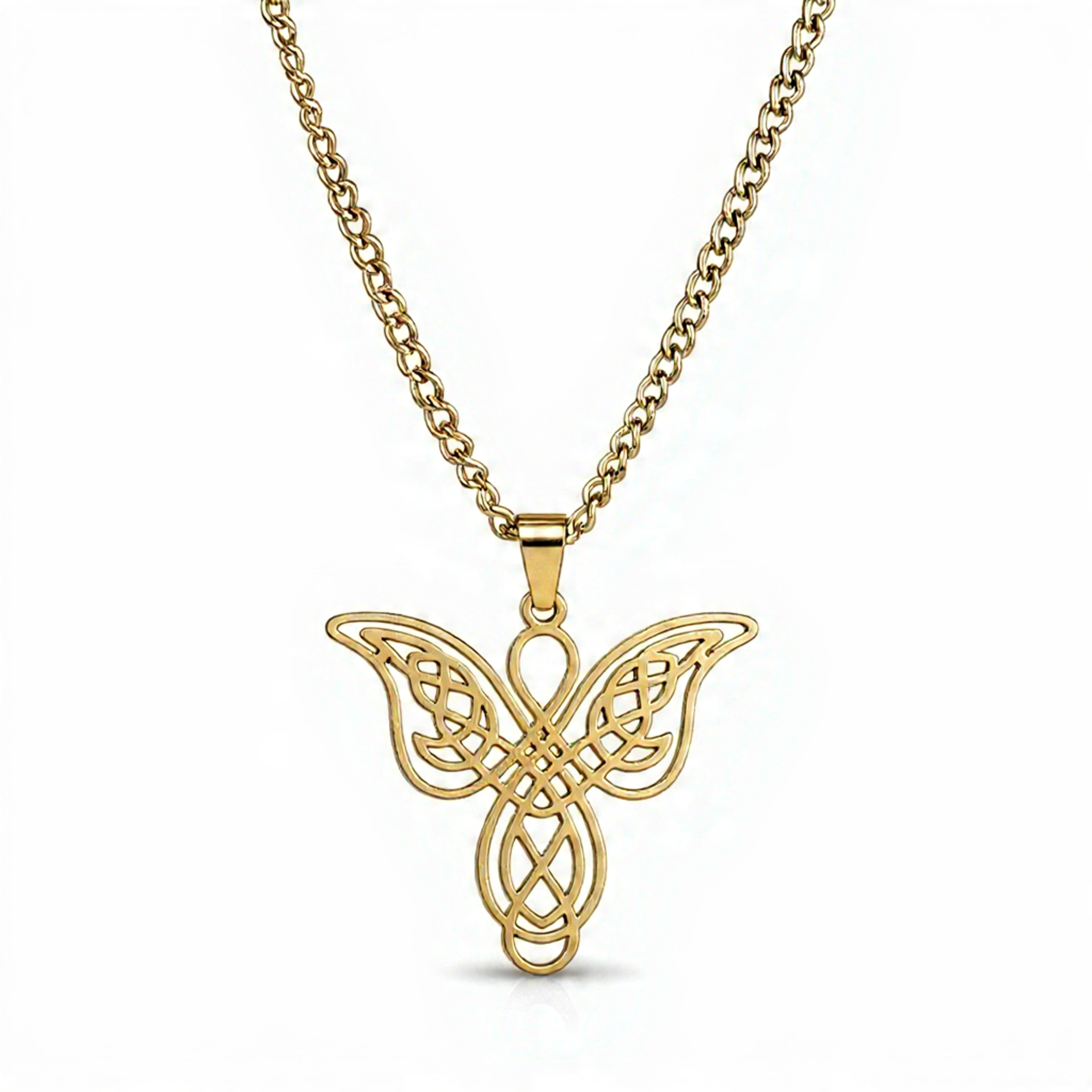 Um colar que une espiritualidade e beleza simbólica.O pingente com design de Nó Celta representa a eternidade e a conexão entre corpo, mente e espírito, enquanto as asas em forma de borboleta simbolizam liberdade, transformação e proteção angelical.