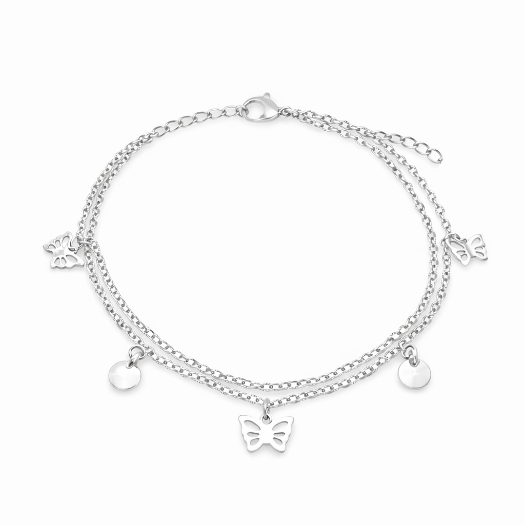 Delicada e encantadora, esta pulseira dupla revela um design sofisticado e cheio de charme. As correntes finas criam um efeito elegante no pulso, enquanto a borboleta vazada traz leveza e um toque poético à peça.