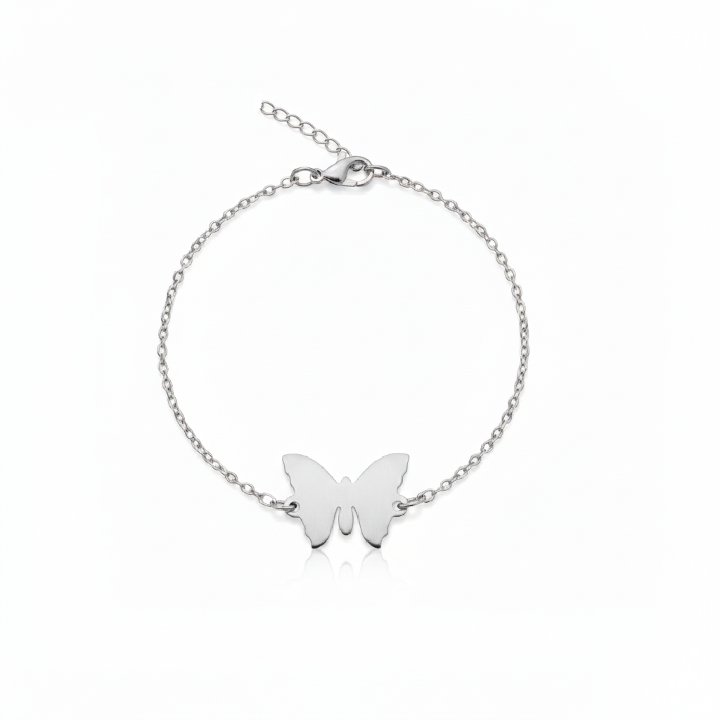 Pulseira em aço inoxidável com delicada borboleta de superfície lisa, destacando um visual clean e elegante.