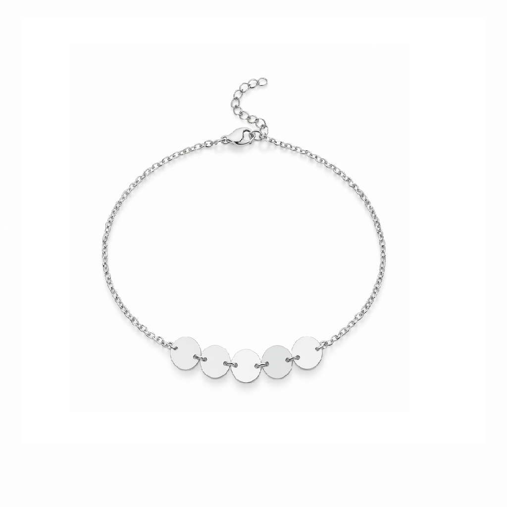 Pulseira em aço inoxidável com cinco círculos delicadamente alinhados, criando um design moderno e minimalista.