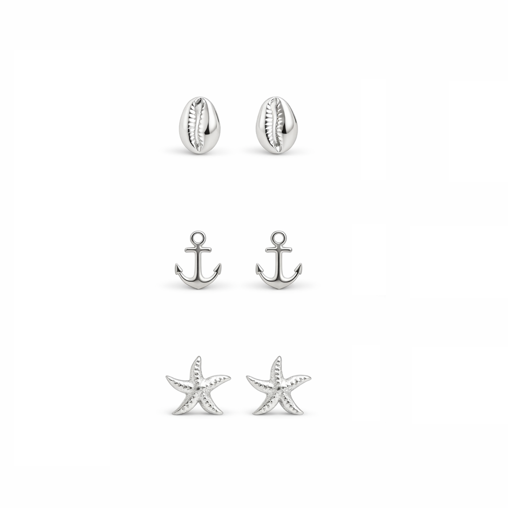 Uma composição delicada que une elementos do universo marinho em um trio harmonioso e sofisticado. O design minimalista valoriza cada detalhe, trazendo leveza e personalidade ao visual. Produzidos em aço inoxidável, oferecem brilho duradouro e alta resistência. Perfeitos para um estilo moderno com um toque de exclusividade